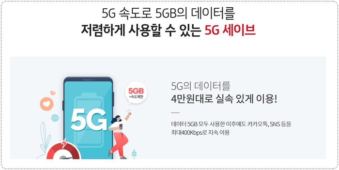 마지막 KT 5G 중간요금제는 4만 원 대의 5G 세이브입니다. 5G 데이터를 실속 있게 5GB 사용할 수 있습니다. 모두 소진 시에도 400 Kbps속도로 무제한 이용가능합니다. 메신저 대화정도 사용할 수 있는 속도입니다.