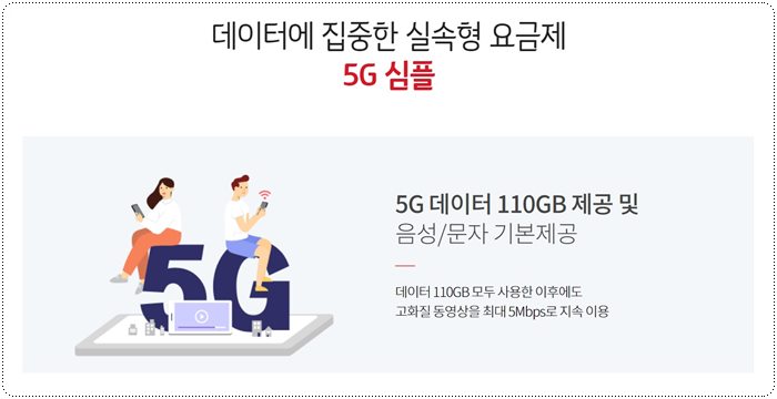 유튜브, 넷플릭스 시청 등으로 데이터를 많이 쓰시는 분들에게 권해드리는 5G 심플입니다. 69,000원 요금으로 월 110GB 사용할 수 있으며, 모두 소진 시에도 5 Mbps속도로 무제한 이용가능합니다. 고화질 영상재생 및 각종 인터넷 이용에 문제가 없는 빠른 속도입니다. (🔎데이터 무제한 속도별 (5 Mbps, 3 Mbps, 1 Mbps) 이용할 수 있는 서비스)